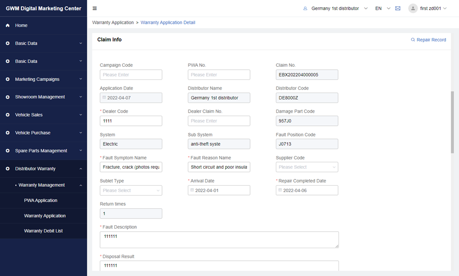 5 Click the warranty claim row that leads to the details page of this warranty application form