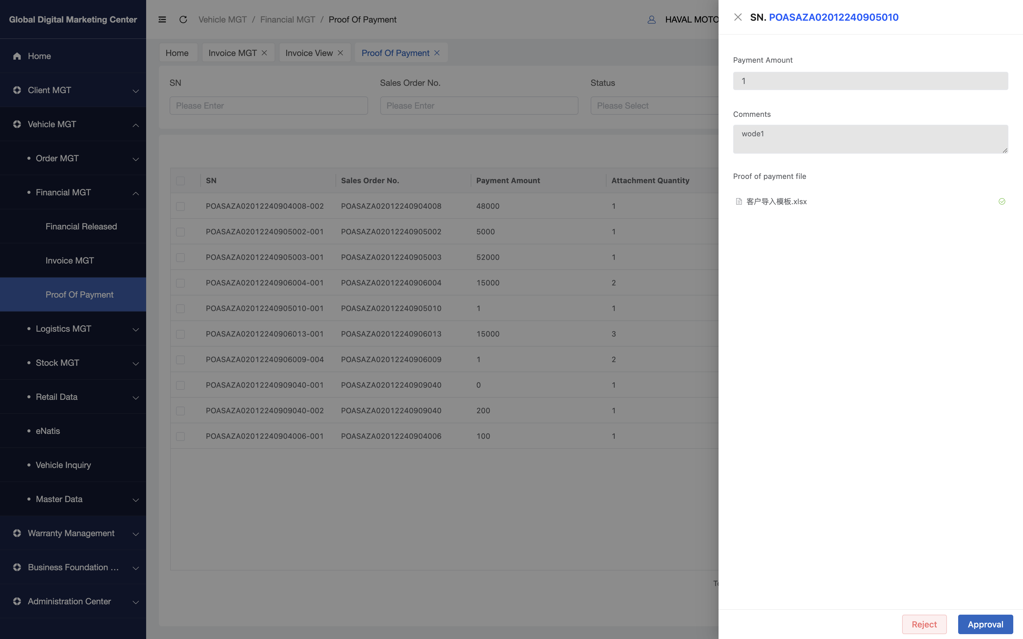 This function contains all the proof of payment order, so you can approval for them here and check the details.