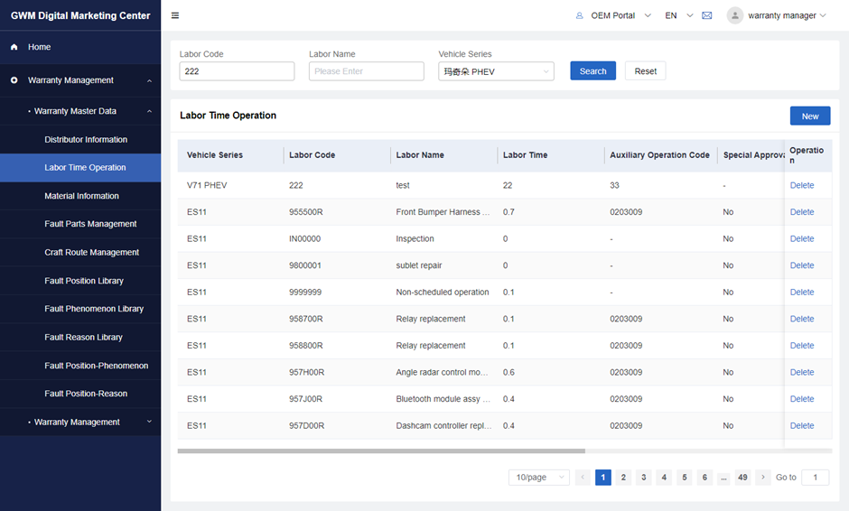 You can also delete dealer’s warranty configuration information by clicking on delete. But the precondition is that there are no claims records of this dealer.